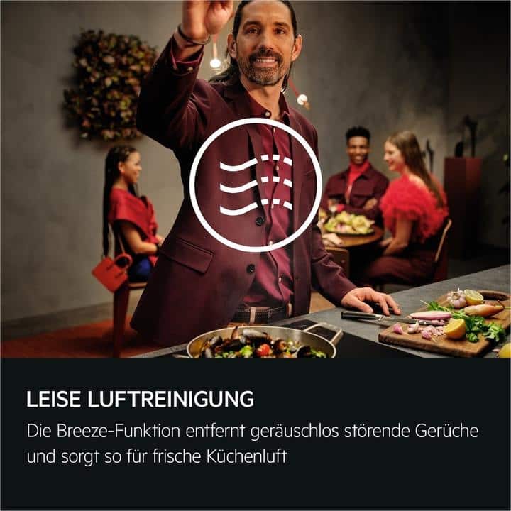 Dotykové ovládání na skle je přehledné a přesné; k dispozici jsou 3 rychlosti + 2 intenzivní stupně pro okamžité zvýšení výkonu. Funkce Hob²Hood bezdrátově propojí odsavač s kompatibilní varnou deskou a podle nastavené teploty automaticky přizpůsobí výkon. Po dovaření aktivujte Breeze, která vzduch tiše dočistí bez zbytečného hučení.