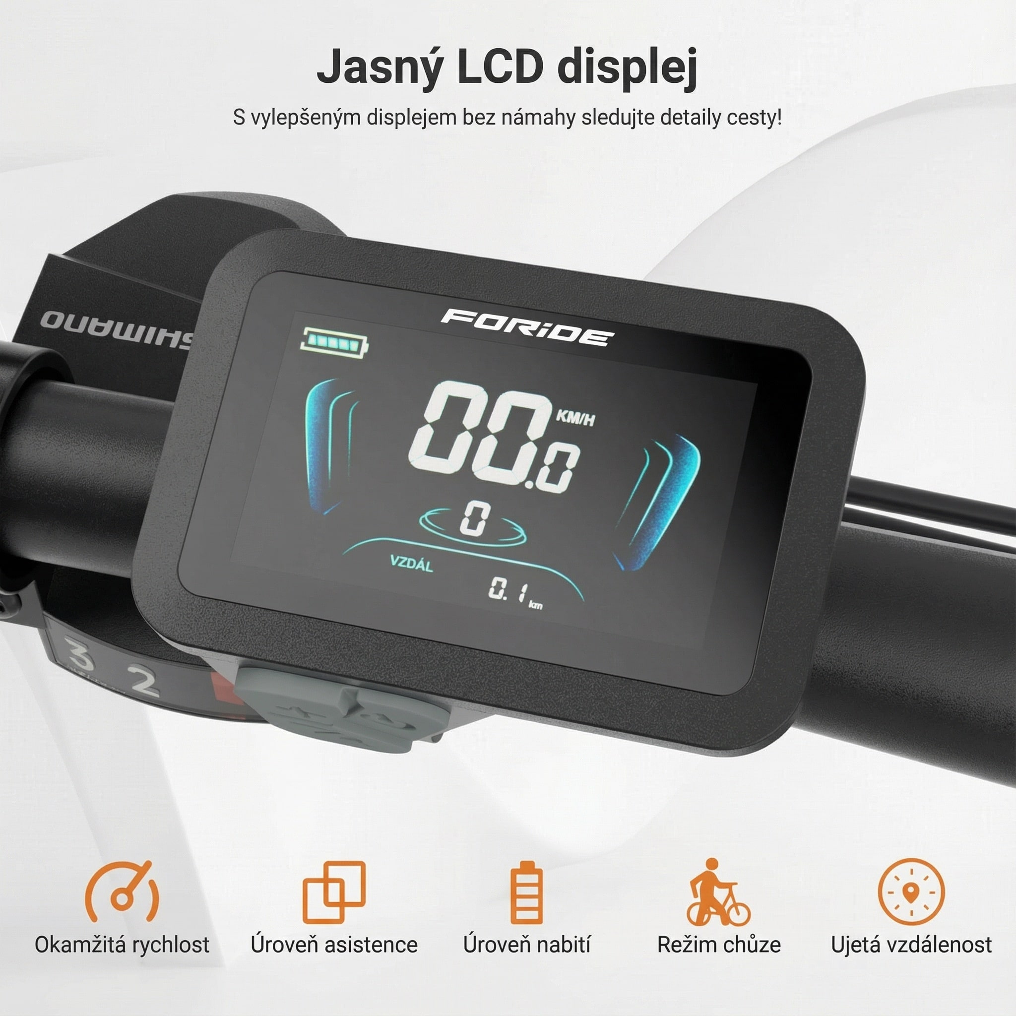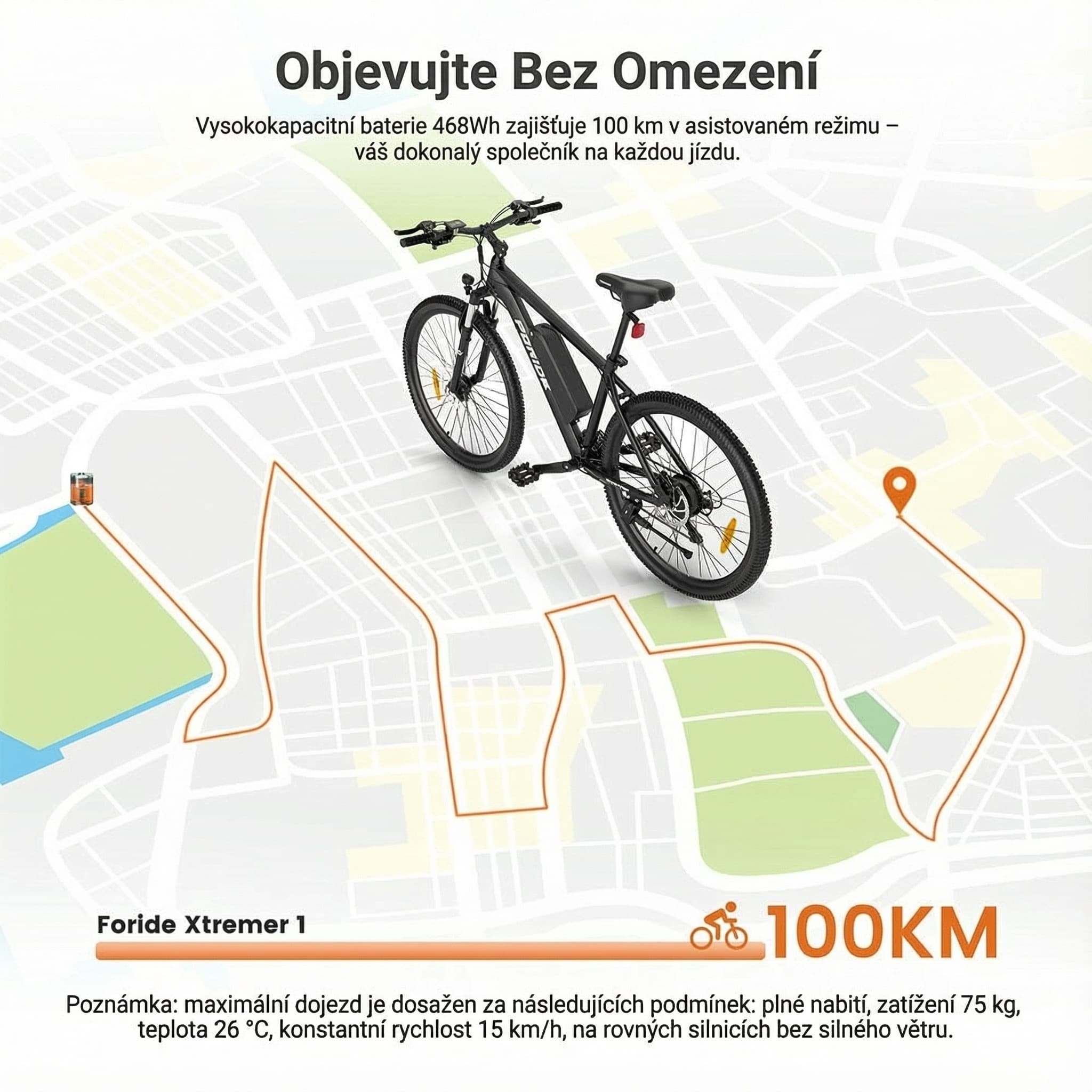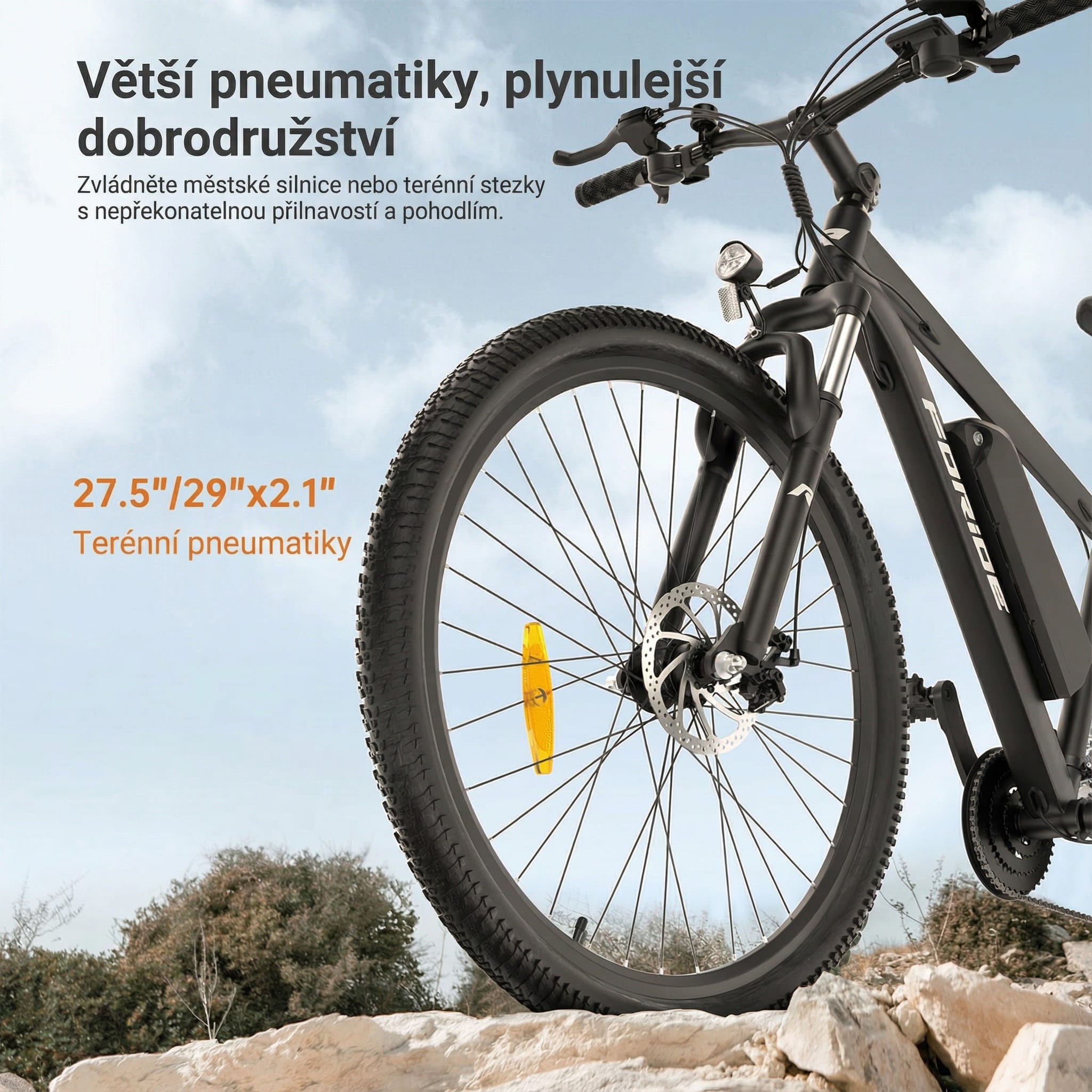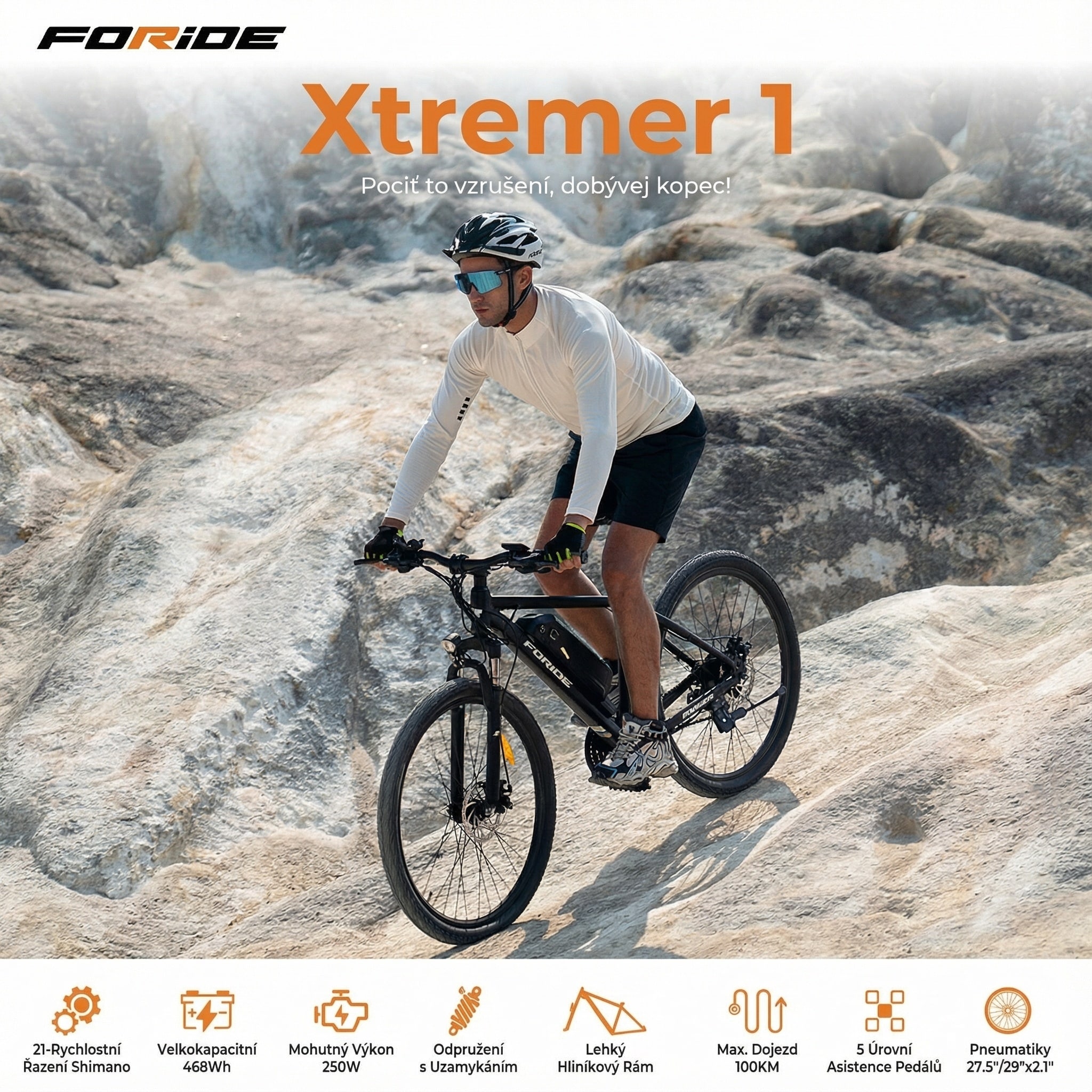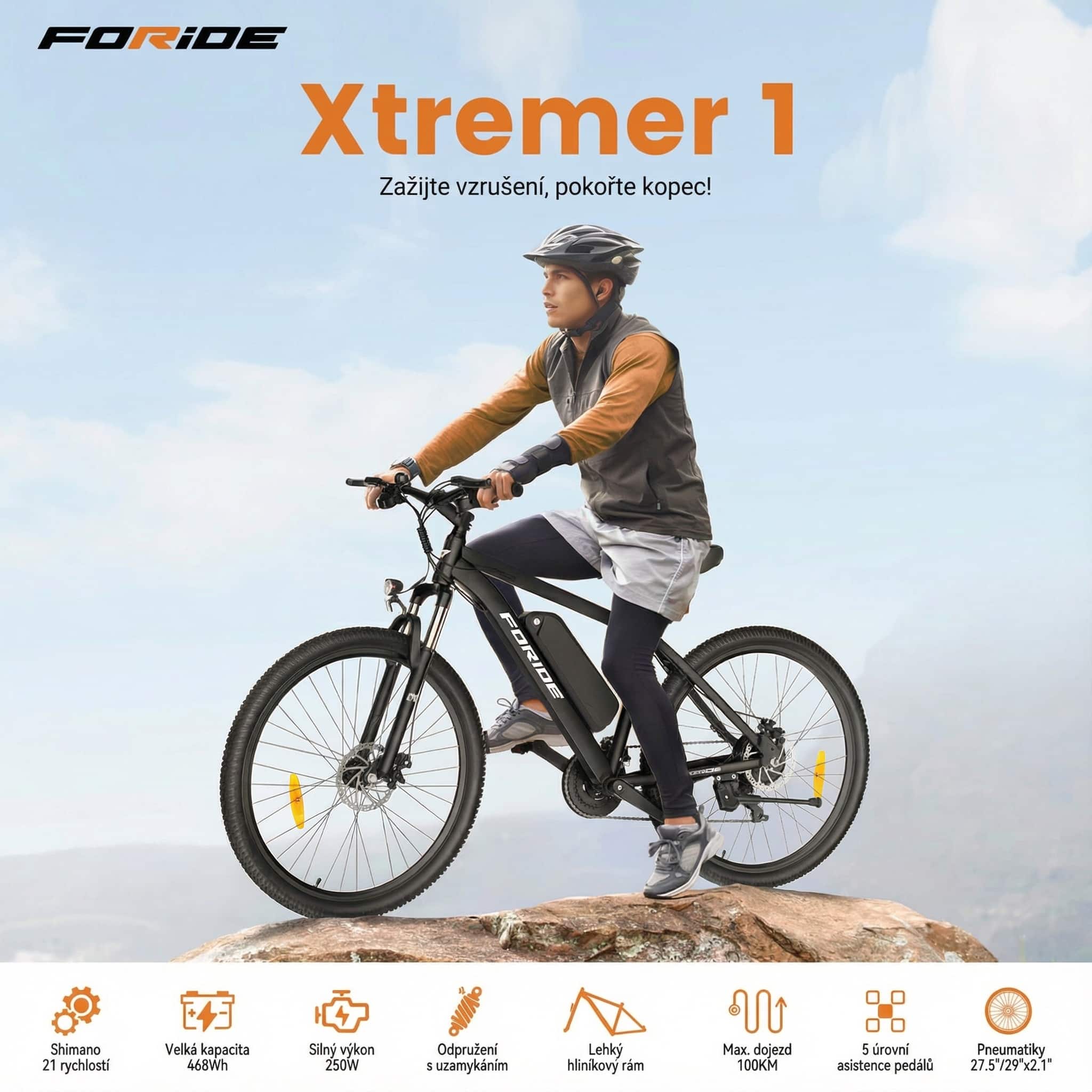 Foride Xtremer 1 (X1 Mountain Electric Bike) je moderní hardtail elektrokolo pro městské dojíždění, cyklostezky a lehký off-road po šotolině a polních cestách. Kombinuje lehký hliníkový rám, odpruženou vidlici 80 mm s lockoutem a zadní nábojový motor 250 W / 36 V s točivým momentem až 50 Nm. Na výběr jsou kola 27.5″ (pro obratnost) nebo 29″ (pro stabilitu). Integrované přední LED světlo se StVZO a zadní světlo/odraz zvyšují bezpečnost. 2,6″ LCD displej zobrazuje rychlost, úroveň PAS, stav baterie, vzdálenost a Walk mód. Lithiová baterie 36 V / 13 Ah (468 Wh) je vyjímatelná a uzamykatelná, reálný dojezd až 100 km v optimálních podmínkách. O jistotu se starají mechanické kotoučové brzdy a e-brake. Pláště CST 2.1″ s tlakem 35–40 PSI, maximální zatížení 120 kg, doporučená výška jezdce 160–200 cm. Elektronika má IPX4 odolnost vůči stříkající vodě.