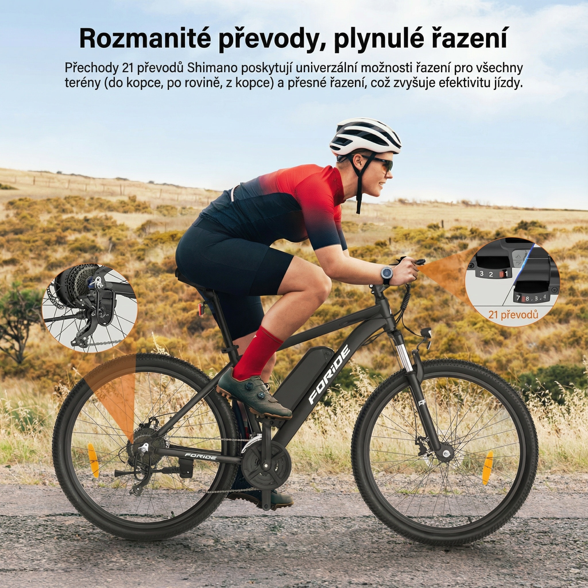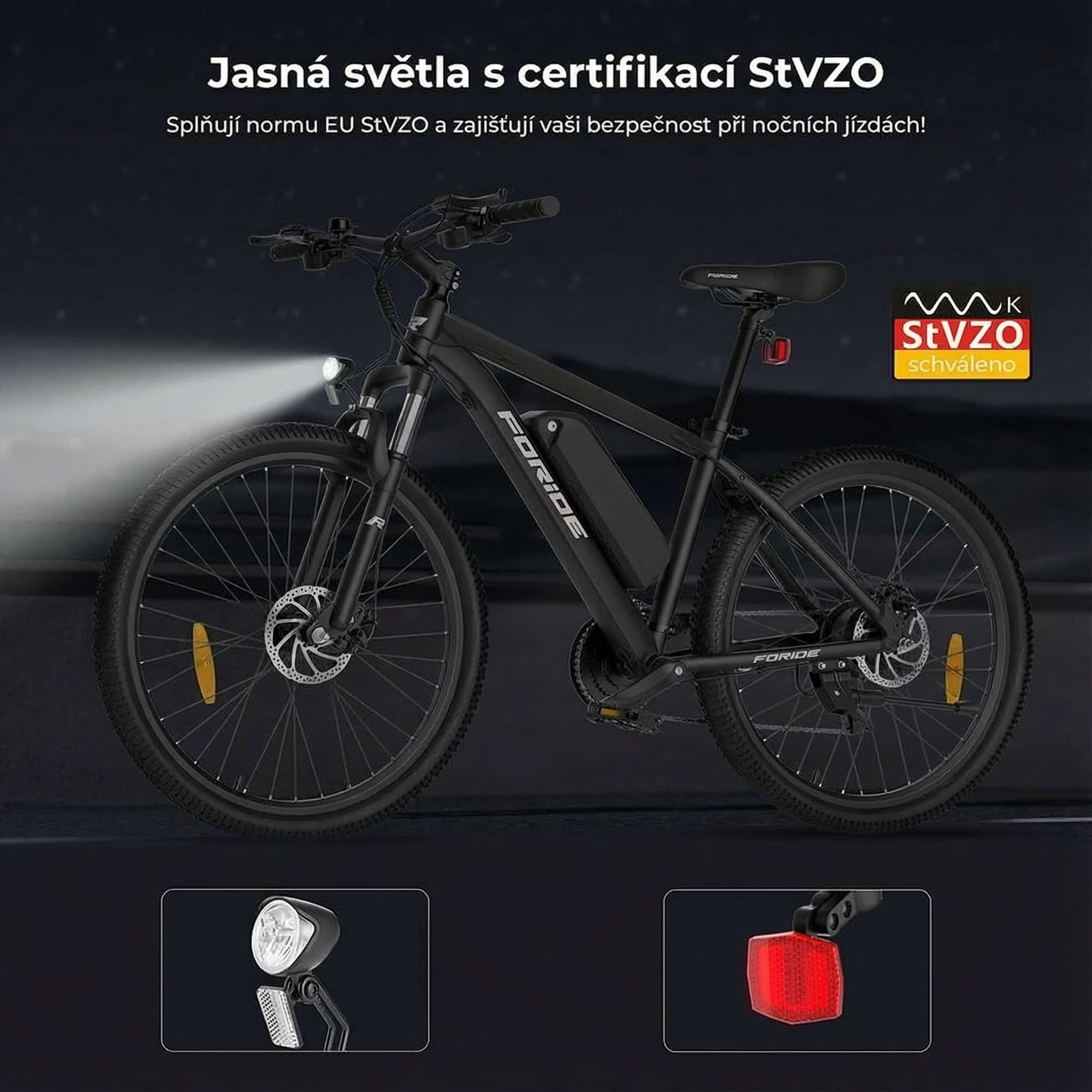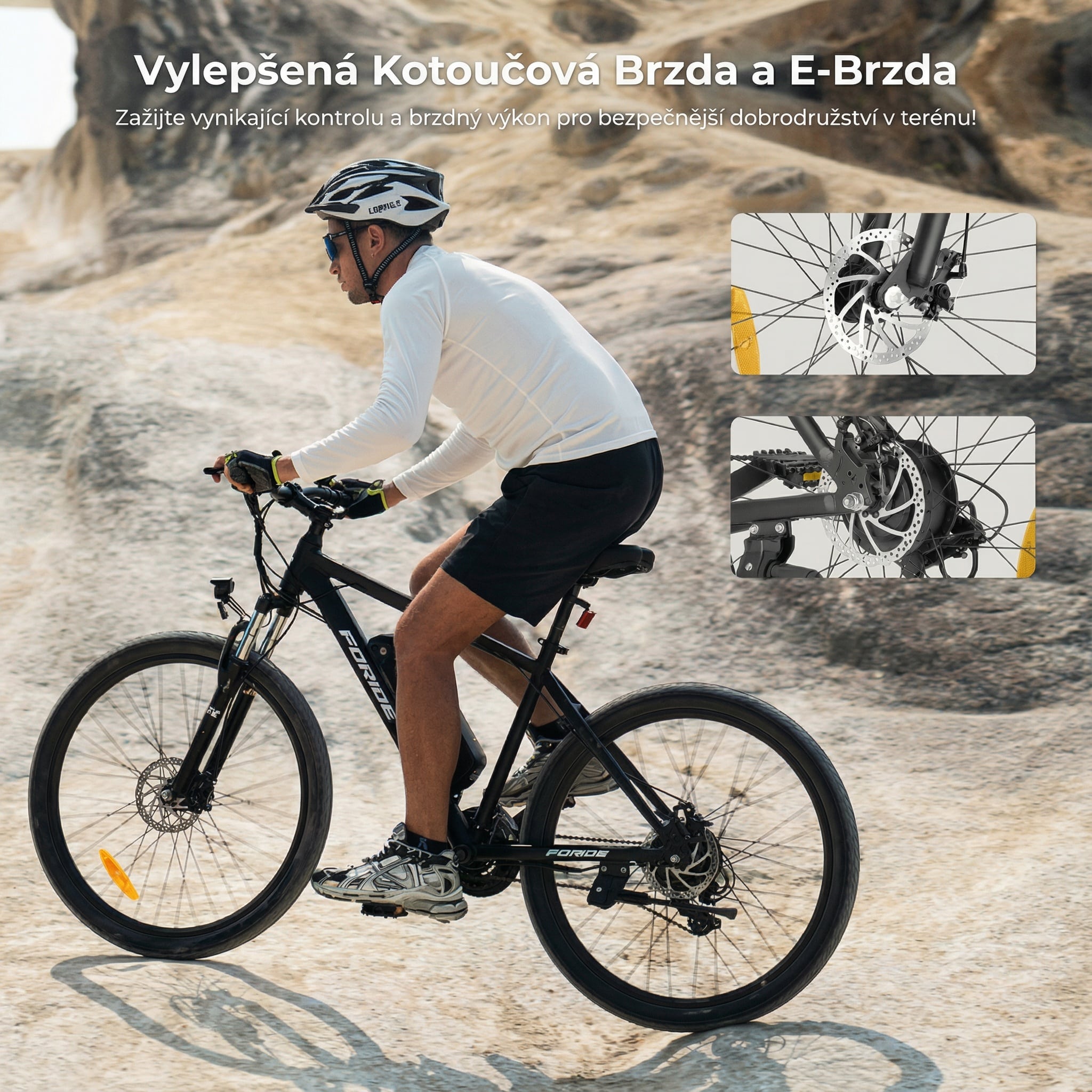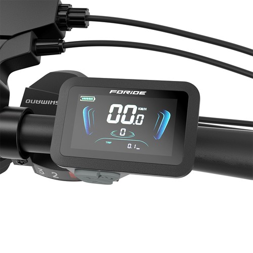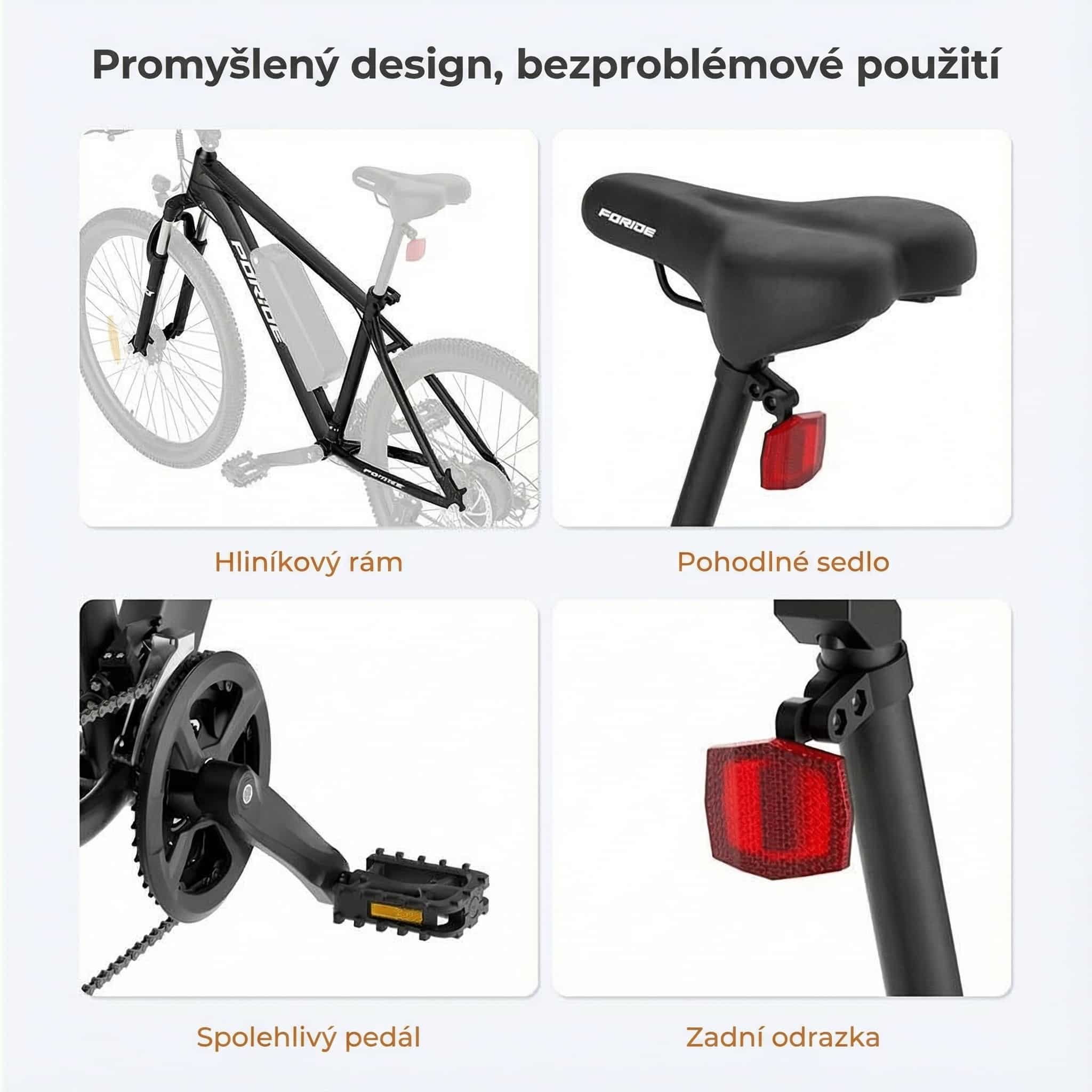 Foride Xtremer 1 (X1 Mountain Electric Bike) je moderní hardtail elektrokolo pro městské dojíždění, cyklostezky a lehký off-road po šotolině a polních cestách. Kombinuje lehký hliníkový rám, odpruženou vidlici 80 mm s lockoutem a zadní nábojový motor 250 W / 36 V s točivým momentem až 50 Nm. Na výběr jsou kola 27.5″ (pro obratnost) nebo 29″ (pro stabilitu). Integrované přední LED světlo se StVZO a zadní světlo/odraz zvyšují bezpečnost. 2,6″ LCD displej zobrazuje rychlost, úroveň PAS, stav baterie, vzdálenost a Walk mód. Lithiová baterie 36 V / 13 Ah (468 Wh) je vyjímatelná a uzamykatelná, reálný dojezd až 100 km v optimálních podmínkách. O jistotu se starají mechanické kotoučové brzdy a e-brake. Pláště CST 2.1″ s tlakem 35–40 PSI, maximální zatížení 120 kg, doporučená výška jezdce 160–200 cm. Elektronika má IPX4 odolnost vůči stříkající vodě.