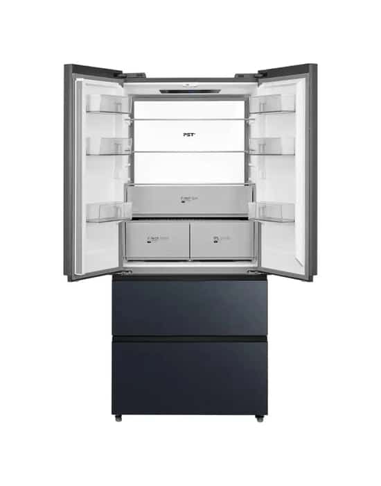 French Door konstrukce se dvěma horními dveřmi a spodními zásuvkami nabízí prostornou kapacitu 515 l pro velké nákupy a přehledné uložení potravin. Interiér je navržen pro přehlednou organizaci s odolnými skleněnými policemi a osvětluje jej LED osvětlení, zatímco cirkulace Multi Air Flow udržuje stabilní teplotu v celém prostoru.