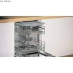 Plně integrovaná myčka nádobí Bosch Serie 4 SBH4ECX28E s otevřenými dveřmi a koši.