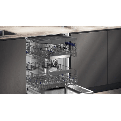 Myčka má flexibilní vnitřní prostor, který umožňuje upravit koše podle velikosti a typu nádobí, které potřebujete umýt. Funkce rackMatic umožňuje nastavit horní koš do tří různých poloh, čímž se zvyšuje flexibilita a komfort při používání.