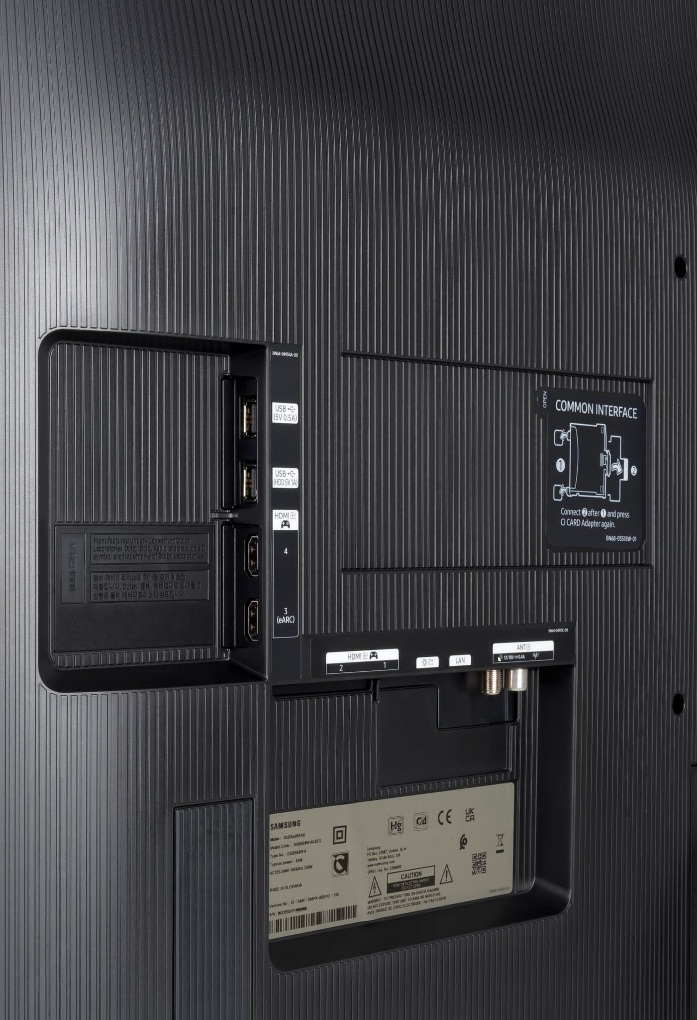 Zadní strana televizoru Samsung s porty včetně HDMI, USB, optiky a CI+ slotu.