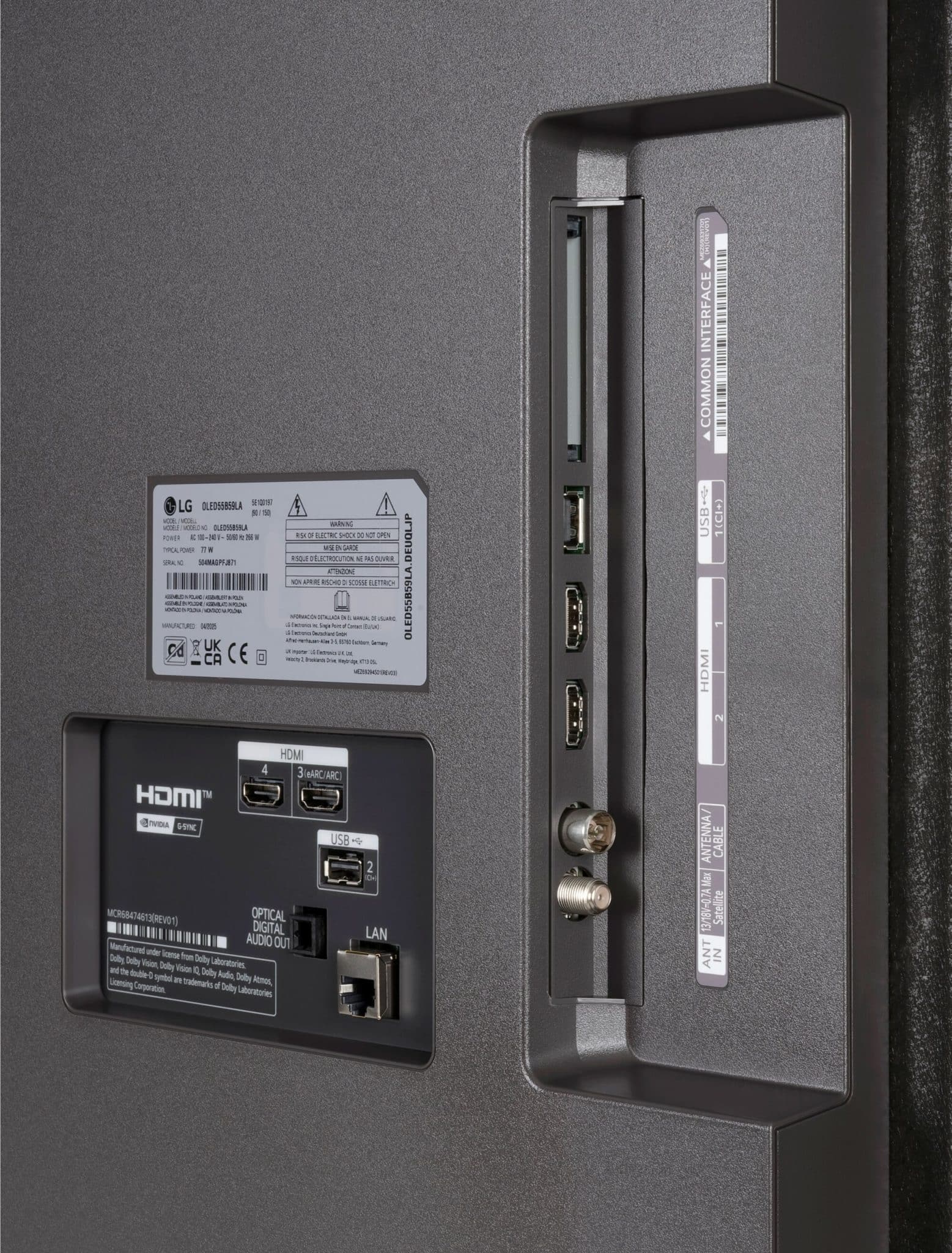 Zadní část LG OLED55B59LA s rozhraním: HDMI, USB, LAN a optický audio výstup